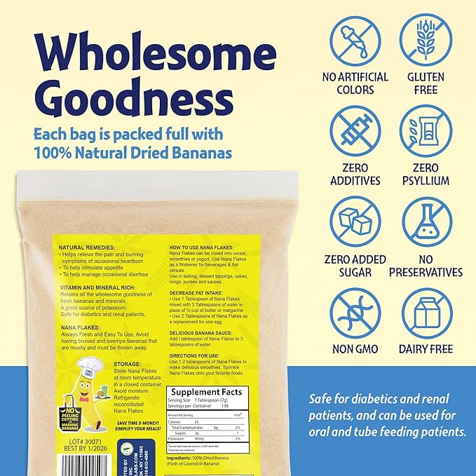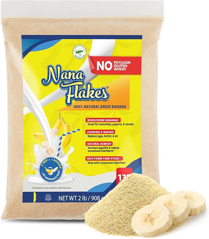 Nana Flakes 100% Pure Banana Flakes Medical Food Powder - Decrease Fat Intake & Natural Remedy for Diarrhea & Heart Burn - Great Source of Protein & Fiber (Banana, Two Pound Bag)