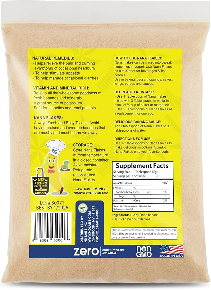 - GREAT FLAVOR: If you savor the taste of banana and the health benefits that come along with it, you’re going to love Nana Flakes. You can easily mix the powder into cereal, smoothies or yogurt; use it to thicken beverages and hot cereal; or add flavor to desert toppings, cakes, icings, purees and sauces.