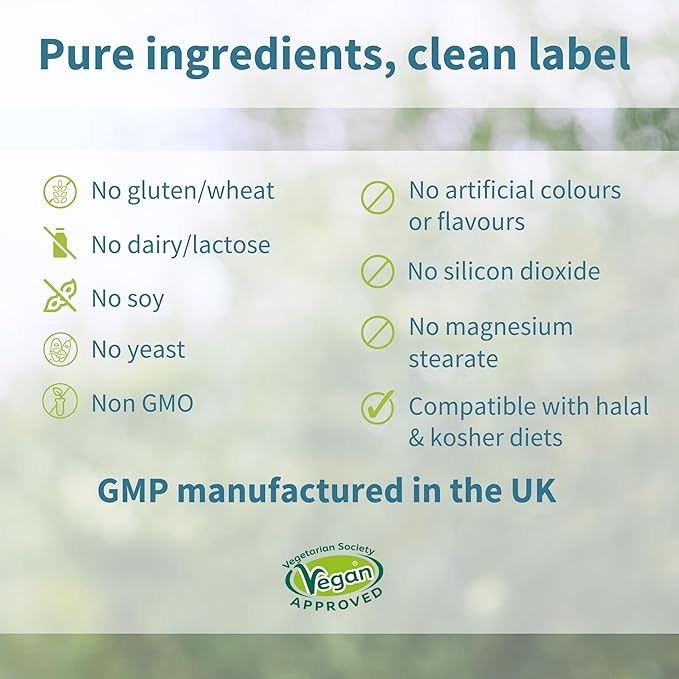 - PURE & CLEAN vegan, non-GMO, hypoallergenic & lab-verified ingredients with no unpleasant fillers (silicon dioxide, magnesium stearate or titanium dioxide). GMP manufactured in the UK