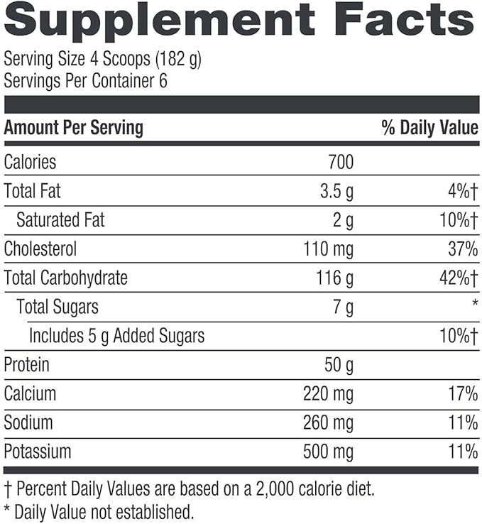 - POWER UP FOR A BIG DAY WITH 700 CALORIES: High-quality protein fuels muscles and 115-117g of a dual carbohydrate system preserves and replenishes energy stores.