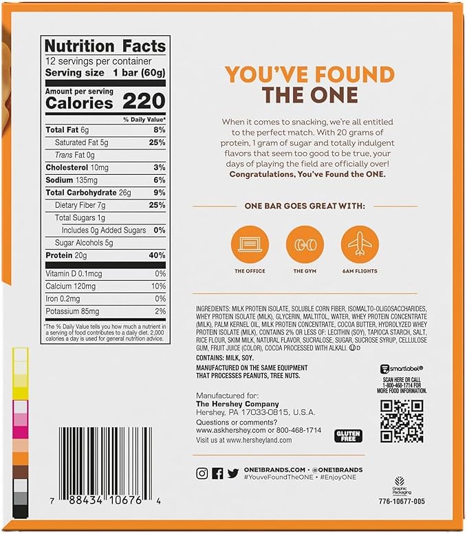 - THE ONE PROTEIN BAR: Discover all the mouthwatering, high-protein bars from ONE! Whether you're craving our classic core flavors, limited-edition options, or even a Hershey's ONE Reese's Peanut Butter Lovers Bar, weve got something for every taste. Packed with protein and flavor, these bars are perfect for fueling everyday. Try them all and find your next pantry staple today!