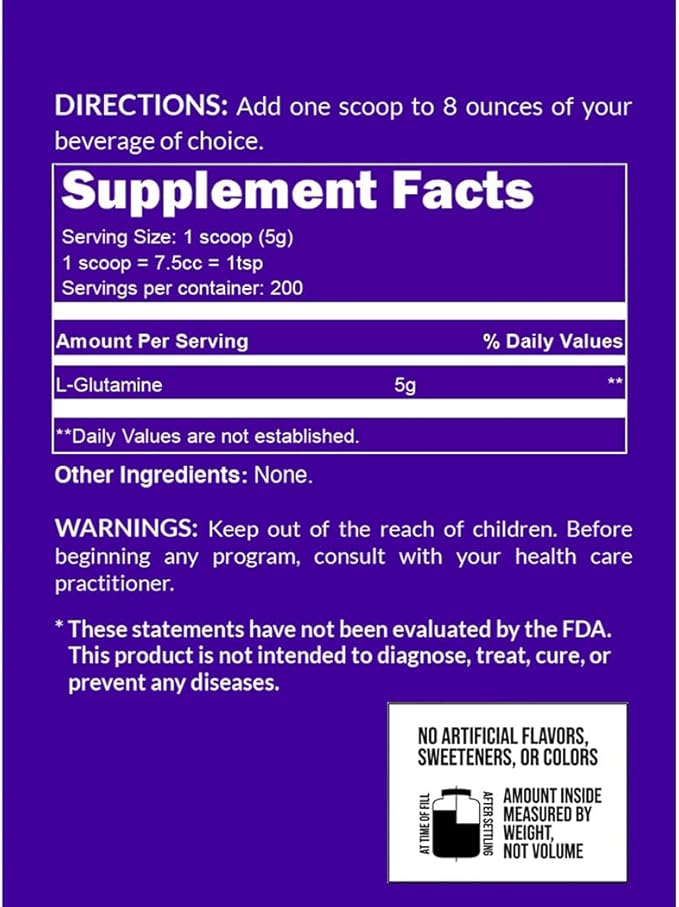 Pure L-Glutamine Made in The USA - 200 Servings - 1,000g, 2.2lb Bulk, Vegan, Non-GMO, Gluten and Soy Free. Minimize Muscle Breakdown & Improve Protein Synthesis. Nothing Artificial