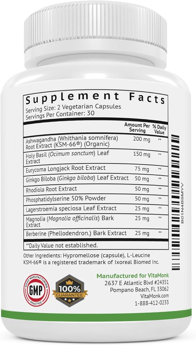 - All-in-one Pill To Nutritionally Support Healthy Stress Levels (already within normal ranges) - VitaMonk’s natural stress relief formula was crafted by licensed doctors to contain highly potent doses of ashwagandha, soy free phosphatidylserine, rhodiola rosea, ginkgo biloba, and tongkat ali (and no magnesium stearate). These natural ingredients are adaptogens, scientifically shown to support stress management (already within normal ranges) and reduce cortisol (already within normal ranges).