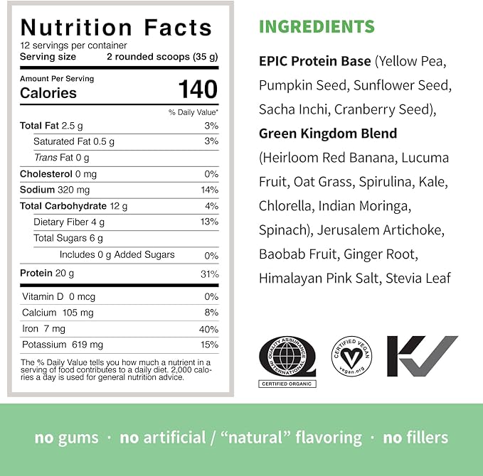 Sprout Living Epic Protein, Plant Based Protein & Superfoods Powder, Green Kingdom | 20 Grams Organic Protein Powder, Greens, Vegan, Non Dairy, Non-GMO, Gluten Free, Low Sugar (1 Pound, 12 Servings)