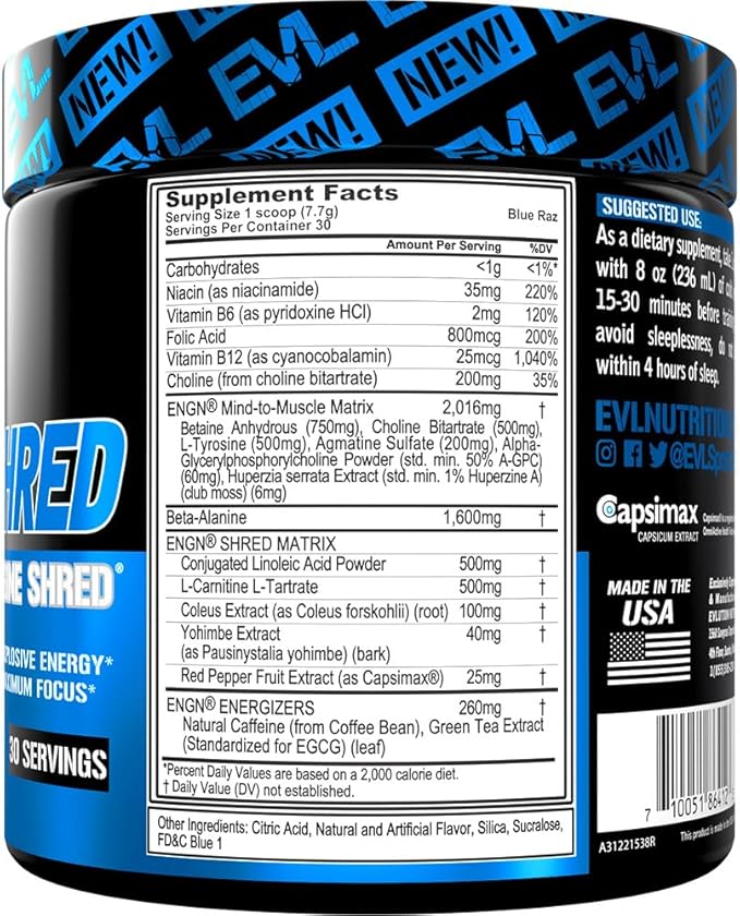EVL Ultimate Pre Workout Powder - Thermogenic Fat Burn Support Preworkout Powder Drink for Lasting Energy Focus and Stamina - ENGN Shred Intense Creatine Free Preworkout Drink Mix - Blue Raz