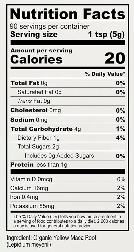 - Made from 100% Raw, Non-Gelatinized White and Yellow Maca Roots