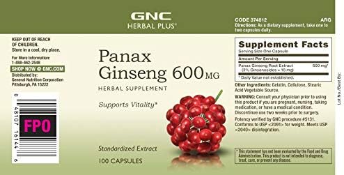 GNC Herbal Plus Panax Ginseng 600mg, 100 Capsules, Supports Vitality