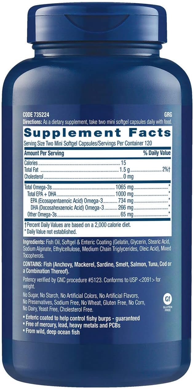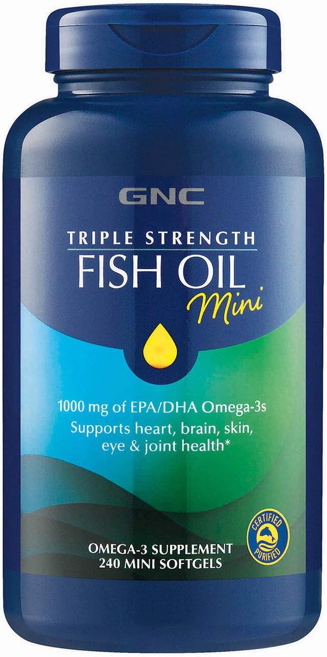 - Help support your heart, brain, skin, eye and joint health with GNC Triple-Strength Fish Oil Mini softgels. This daily dietary supplement offers 1,000mg of EPA/DHA Omega-3s from wild, deep ocean fish, such as salmon, tuna, cod and anchovy.