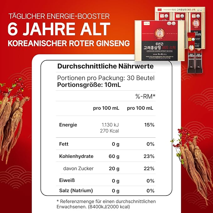 6-Year Korean Red Ginseng Extract 365 | 30 Sticks | Vegan | 7mg Ginsenosides per Stick | Energy, Focus, Fatigue, Immune Support | Supplement for Men & Women