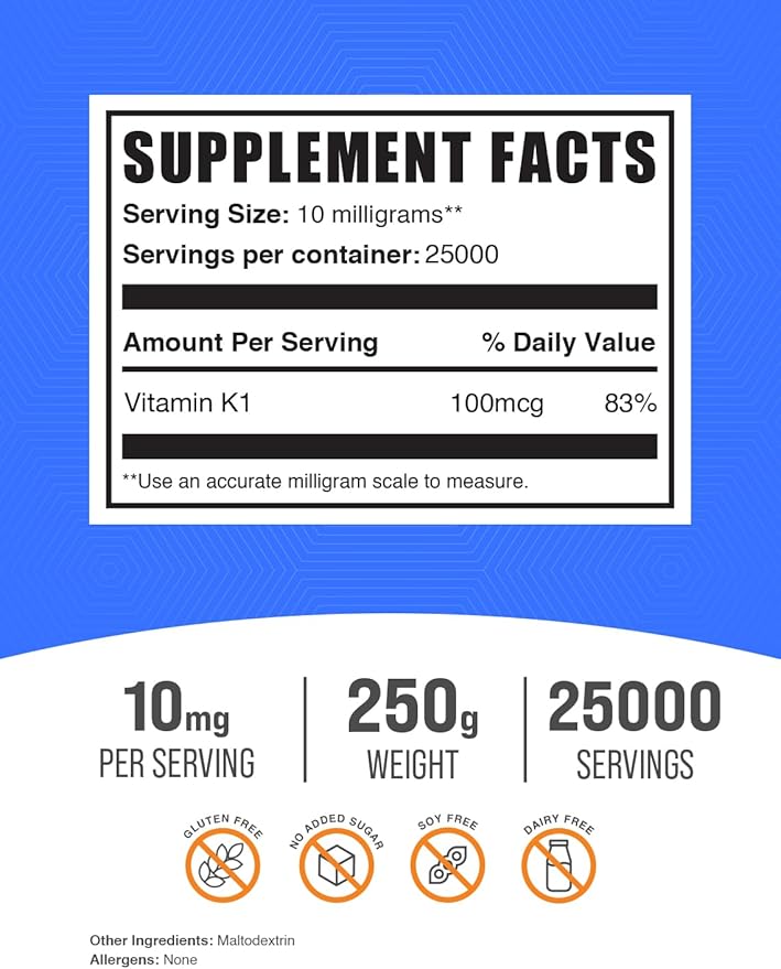 - ❤️ Supports Overall Health and Wellness – Vitamin K1’s benefits of strengthening the bones, and promoting brain heart, and supporting heart health make it an all-around great supplement for overall health. Feeling good and healthy is incomparable to anything else, keep your body healthy by nourishing it with our Vitamin K1 powder. It’s 100% free of additives, artificial flavors or fillers so you can feel confident about what you put into your body.*