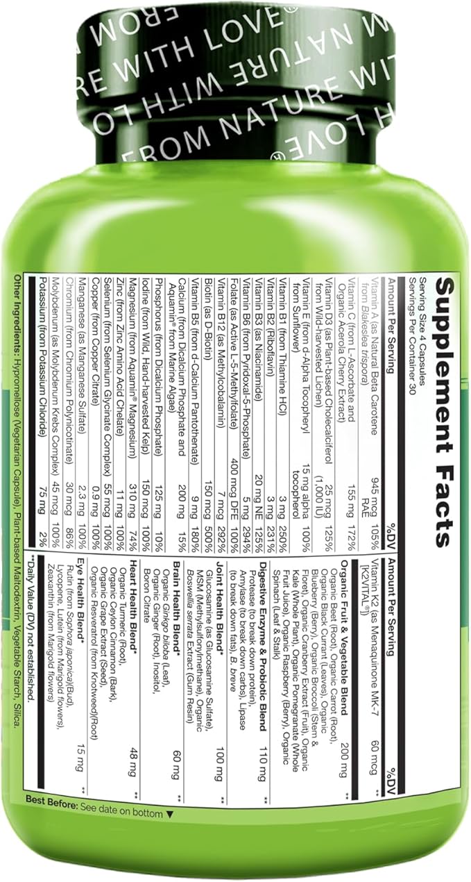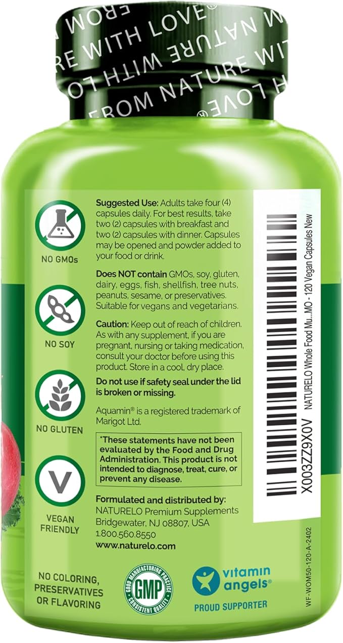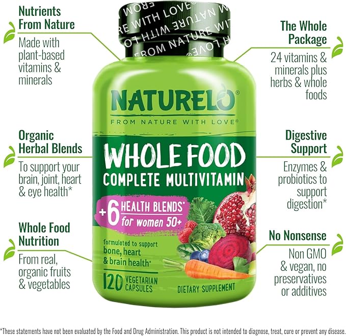 NATURELO Whole Food Multivitamin for Women 50+ (Iron Free) with Vitamins, Minerals, & Organic Extracts - Supplement for Post Menopausal Women Over 50 - No GMO - 120 Vegan Capsules