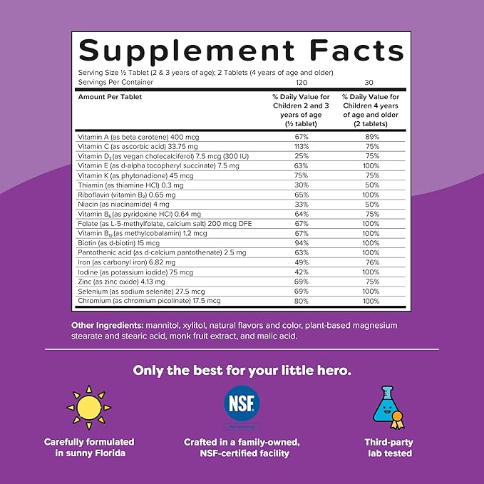 - How to take: Children 2-3 years old take 1/2 tablet daily; children ages 4 and older take 2 tablets daily; our vitamins melt in your kids’ mouth or can also be dissolved in water, juice or even smoothies. Kids can chew them or let them melt without worrying of anything getting left behind on their teeth.