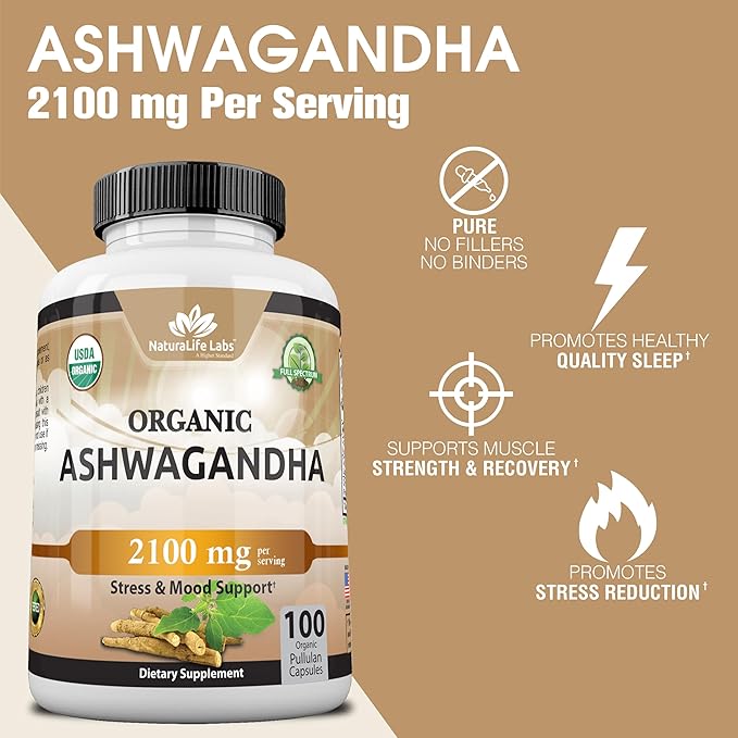 Organic Ashwagandha 2,100 mg - 100 Veggie Capsules Pure Organic Ashwagandha Powder and Root Extract - Stress Relief, Mood Enhancer