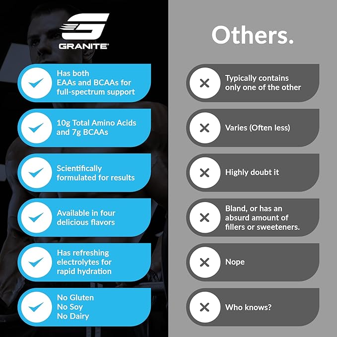 - All-in-One Amino Acids Supplement: Granite EAAs provide 10g of Essential Amino Acids and 7g of BCAAs per serving for growing and rebuilding muscles, and replenishing electrolytes after your toughest workouts.