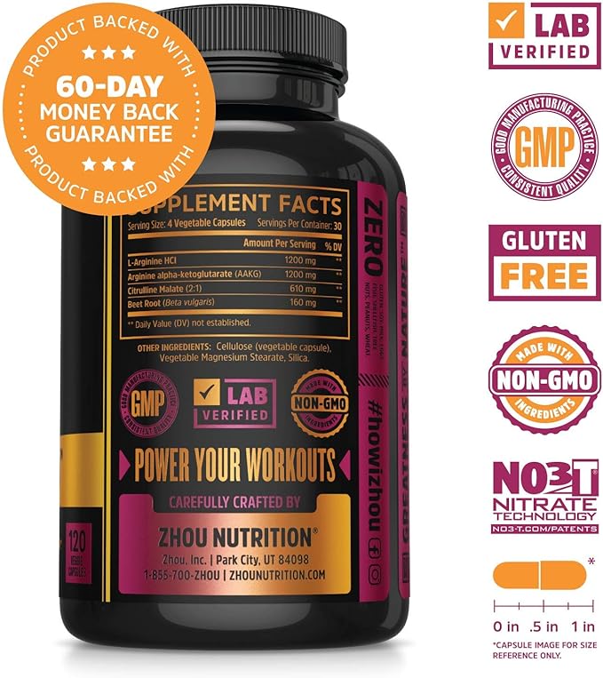 Zhou Nitric Oxide with L Arginine, Citrulline Malate, AAKG and Beet Root | Powerful N.O. Booster and Muscle Builder for Strength, Blood Flow and Endurance | 30 Servings, 120 Veggie Caps