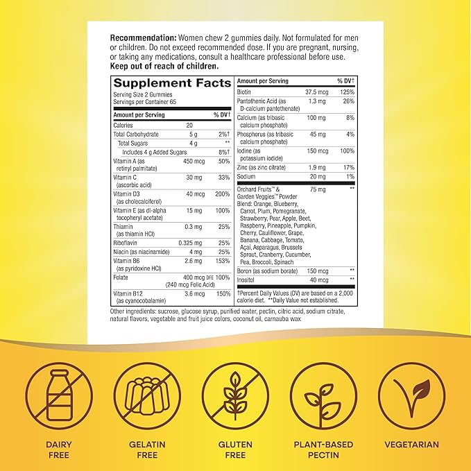 - Formulated with 16 vitamins and minerals for women’s wellness, including B-vitamins, vitamin A, vitamin C, vitamin D3, vitamin E, zinc and biotin, alongside food-based Orchard Fruits & Garden Veggies powder blend (75 mg per 2-gummy serving).*