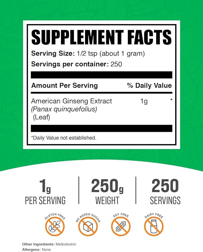 BulkSupplements.com American Ginseng Extract Powder - Ginseng Supplement, Herbal Supplements - Gluten Free, 1g per Serving, 250g (8.8 oz) (Pack of 1)