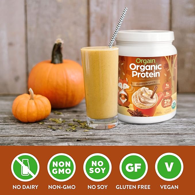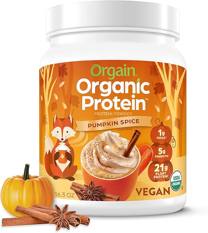 Orgain Organic Vegan Protein Powder, Pumpkin Spice Seasonal Flavor - 21g of Plant Protein, 5g Prebiotic Fiber, No Lactose Ingredients, No Added Sugar, Non-GMO, For Shakes & Smoothies, 1.02 lb