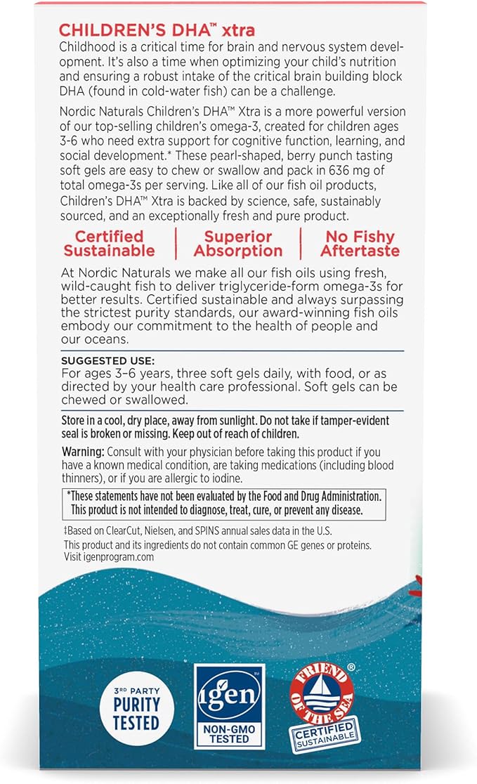 Nordic Naturals Children’s DHA Xtra, Berry Punch - 90 Mini Chewable Soft Gels for Kids - 636 mg Omega-3s EPA & DHA - Cognitive & Immune Function, Learning, Social Development - Non-GMO - 30 Servings