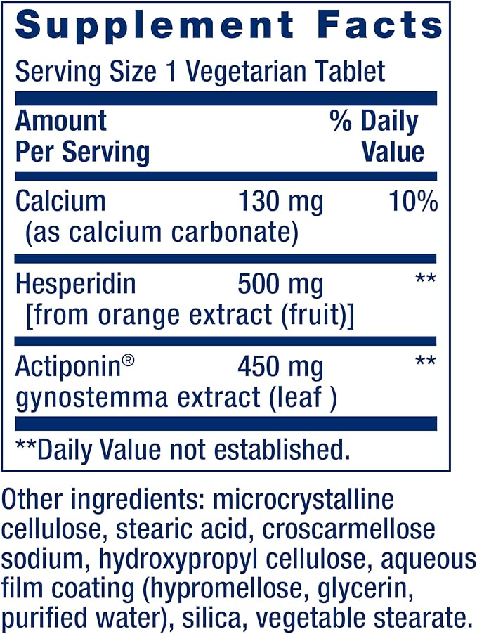 - Special Ingredients : Calcium, Hesperidin, and Actiponin® gynostemma extract. Other ingredients: microcrystalline cellulose, stearic acid, croscarmellose sodium, hydroxypropyl cellulose, aqueous film coating (hypromellose, glycerin, purified water), silica, vegetable stearate. Calcium, Hesperidin, and Actiponin® gynostemma extract. Other ingredients: microcrystalline cellulose, stearic acid, croscarmellose sodium, hydroxypropyl cellulose, aqueous f… See more