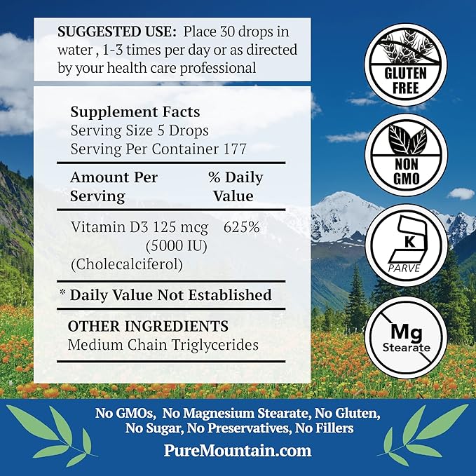 Pure Mountain Botanicals Liquid Vitamin D Drops - Unflavored Kosher D3 Liquid Drops in MCT Oil - 5000IU per Serving - 1oz Bottle