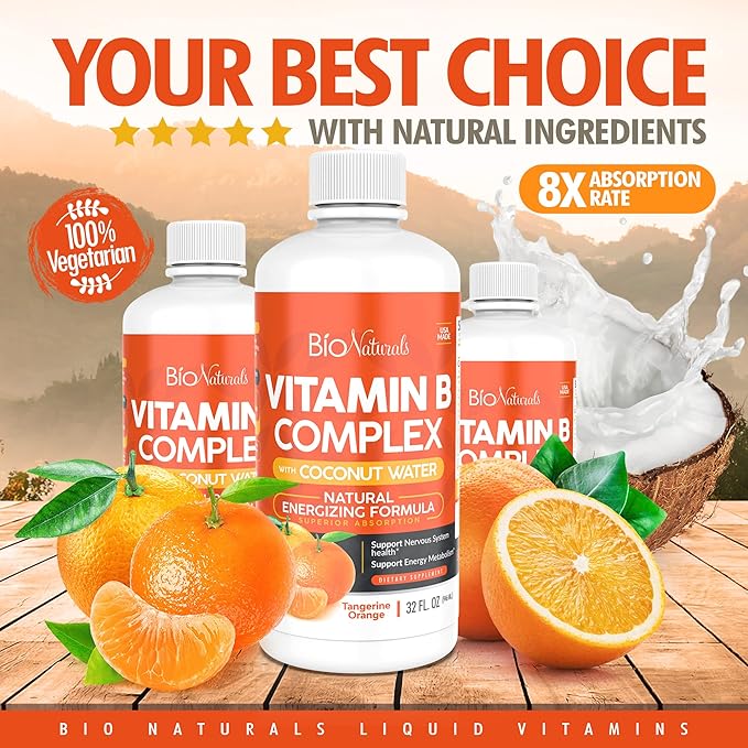 Bio Naturals Vitamin B Complex Liquid Supplement - 100% Natural Energy Boost with Vitamins B1 B2 B3 B5 B6 B12 & Organic Coconut Water for Stress, Mental Focus & Healthy Immune System - 32 fl oz