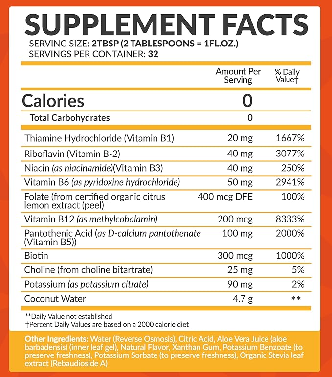 - Energy Booster & Stress Reliever – Our natural formula with a combination of 6 different B vitamins and organic coconut water works by maximizing your body's natural energy. Our liquid supplement also helps with the functioning and development of the brain, nerves and blood cells. Feel the difference!