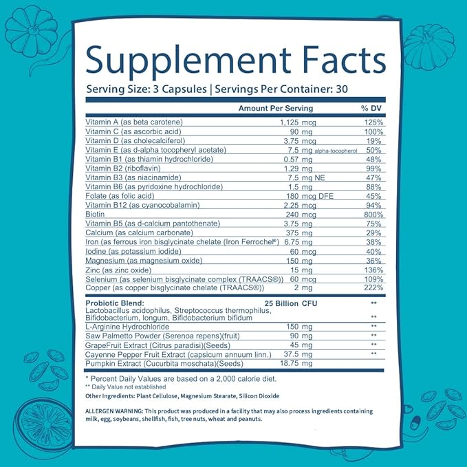 - Special Ingredients : Vitamin A, Vitamin C, Vitamin D, Vitamin E, Thiamin, Riboflavin, Niacin, Vitamin B6, Folate, Vitamin B12, Biotin, Pantothenic Acid, Calcium, Iron, Iodine, Magnesium, Zinc, Selenium, Copper, Probiotic Blend (25 Billion CFU) (Lactobacillus acidophilus, Streptococcus thermophilus, Bifidobacterium Longum, Bifidobacterium bifidum), L-Arginine Hydrochloride, Saw Palmetto Powder, Grapefruit Extract, Cayenne Pepper Fruit Extract, Pumpkin Extract Vitamin A, Vitamin C, Vitamin D, Vitamin E, Thiamin, Riboflavin, Niacin, Vitamin B6, Folate, Vitamin B12, Biotin, Pantothenic Acid, Calciu… See more