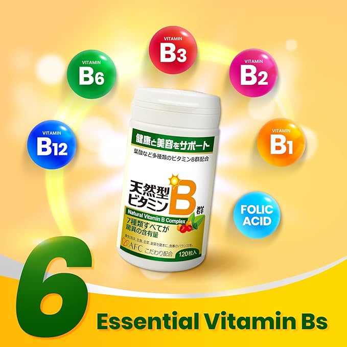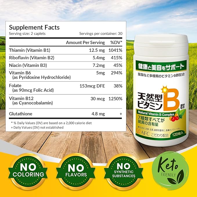 AFC Japan Natural Vitamin B Complex with B1, B2, B3, B6, B12, Folic Acid & Glutathione Yeast Extract, No Synthetics, Non-GMO, Supplement for Stress, Energy, Immune & Nervous System,120 Vegan Caplets