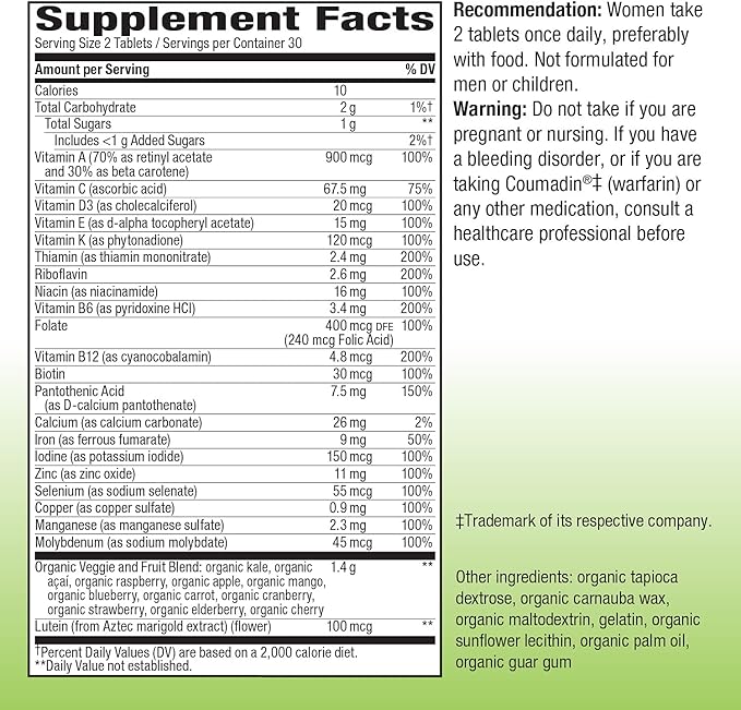 - A multivitamin for women with one serving of vegetables and fruits.** Made with organic kale, acai, and raspberry.