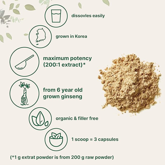 - Organic Panax Korean Red Ginseng Extract Powder 200:1 Concentration (with High Ginsenosides) from 6-Year-Old Ginseng, No GMOs and Vegan Friendly.