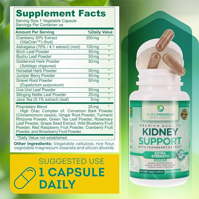 - 21 NATURAL INGREDIENTS: PurePremium kidney supplement combines 21 powerful ingredients, including nettle leaf, juniper berries, uva ursi, chanca piedra. Support your kidney detox effectively and simplify your health routine with our cranberry pills.*