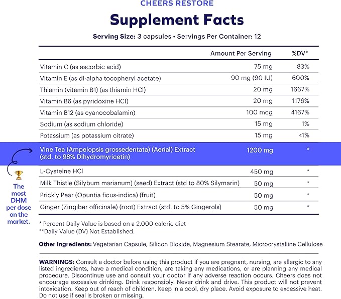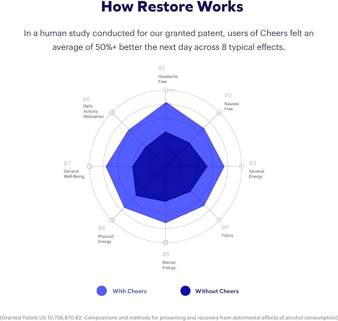 - BENEFITS YOU CAN FEEL: For next-day recovery, our Restore pills use a patented blend of DHM + Cysteine to tackle acetaldehyde exposure and GABA rebound — the main reasons why you feel bad after drinking. (Granted Patent US 10,736,870 B2)