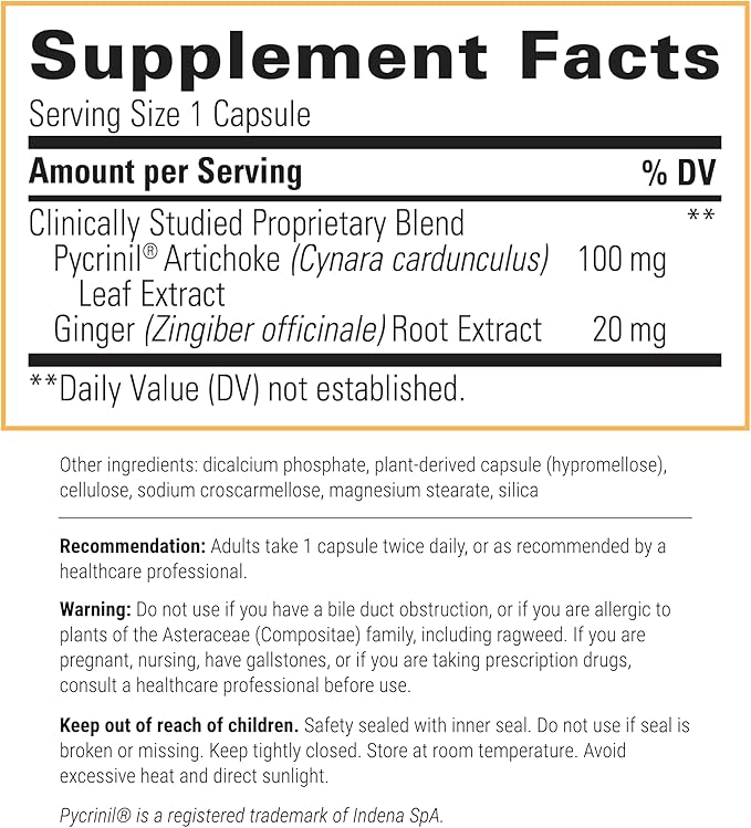 - Artichoke Leaf Extract & Ginger Blend: This supplement contains a proprietary blend of ginger root and artichoke leaf extracts