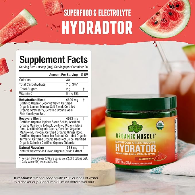 - MAXIMIZE HYDRATION & PERFORMANCE: Unlock the potential of 16 plant-based ingredients found in Organic Muscle’s Hydrator Electrolyte powder. Drink one scoop for a pre-workout boost, stay hydrated during your routine, or recover after it. Enhance your athletic performance with a revitalizing Watermelon flavor.