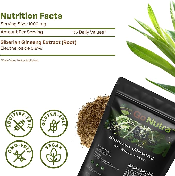 - Concentrated Root Extract - Lean into the power of nature and harness the benefits of our Siberian Ginseng or Eleuthero extract! Go Nutra’s Eleuthero powder boasts a 4:1 concentration ratio potency, providing a concentrated dose of its beneficial properties for enhanced wellness and vitality. It's 4x times stronger than other traditional root powders.