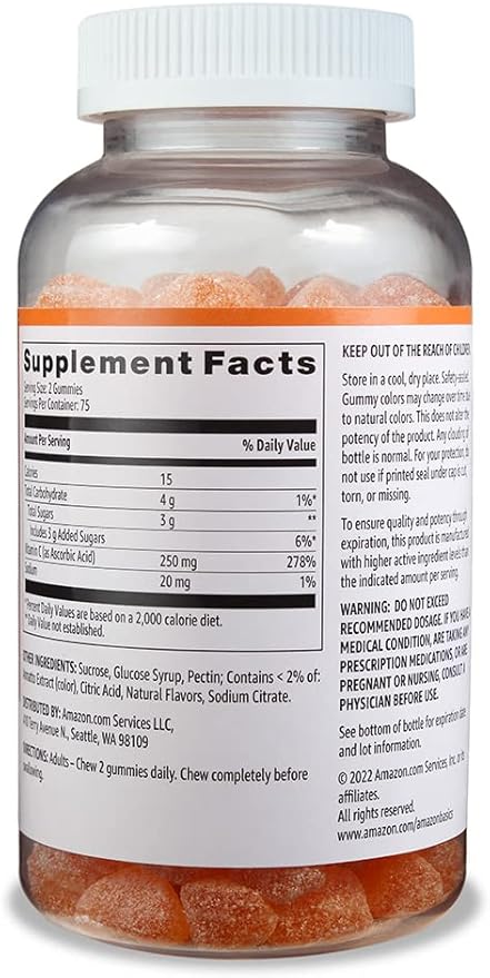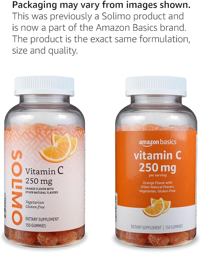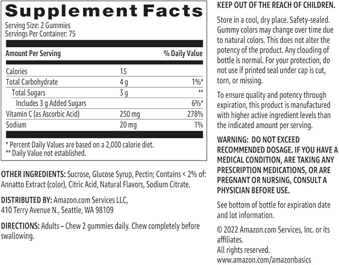Amazon Basics Vitamin C 250 mg Gummies, Orange, 150 Count (2 per Serving), Immune Health (Previously Solimo)