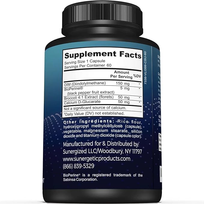 - INCLUDES DIM, CALCIUM D-GLUCARATE & BROCCOLI: Sunergetic's DIM health formula includes 150mg of DIM (diindolylmethane) per capsule, our DIM formula has a blend of ingredients including Calcium D-Glucarate, Broccoli Extract and Bioperine for enhanced absorption.
