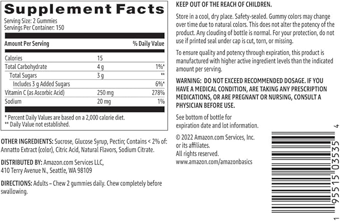 Amazon Basics Vitamin C 250 mg Gummies, Orange, 300 Count (2 Packs of 150), 2 per Serving (Previously Solimo)