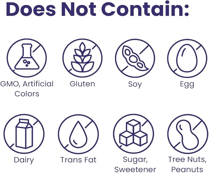 - THIS SUPPLEMENT EXCLUDES: GMO, Artificial Colors, Gluten, Soy, Egg, Dairy, Trans Fat, Sugar, Sweeteners, Tree Nuts, and Peanuts.
