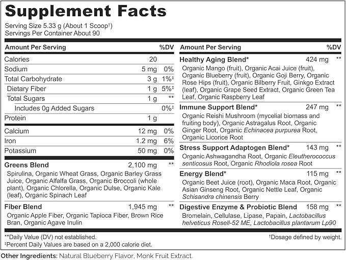 - BLEND OF 35 SUPERFOODS: Made with nutrient-packed whole foods, including raw greens like spirulina, barley grass, alfalfa, wheat grass, chlorella, kale, spinach, and broccoli, and fruits like mango, acai, blueberry, and goji berries.