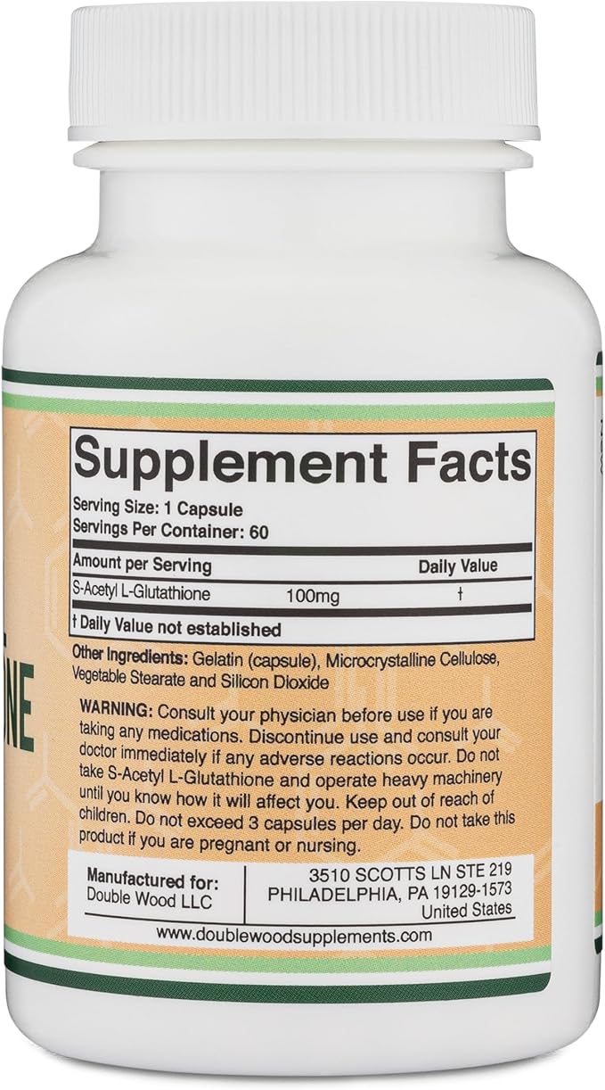 - Manufactured in the USA from Globally Sourced Ingredients and Tested for Purity; Doublewood S Acetyl Glutathione capsules are manufactured right here in New York and Testing is available upon request