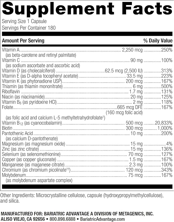 - Bariatric Multivitamin: Each bottle contains 60 capsules, with a recommended use of 1 capsule taken 2 times daily or as recommended by your healthcare practitioner