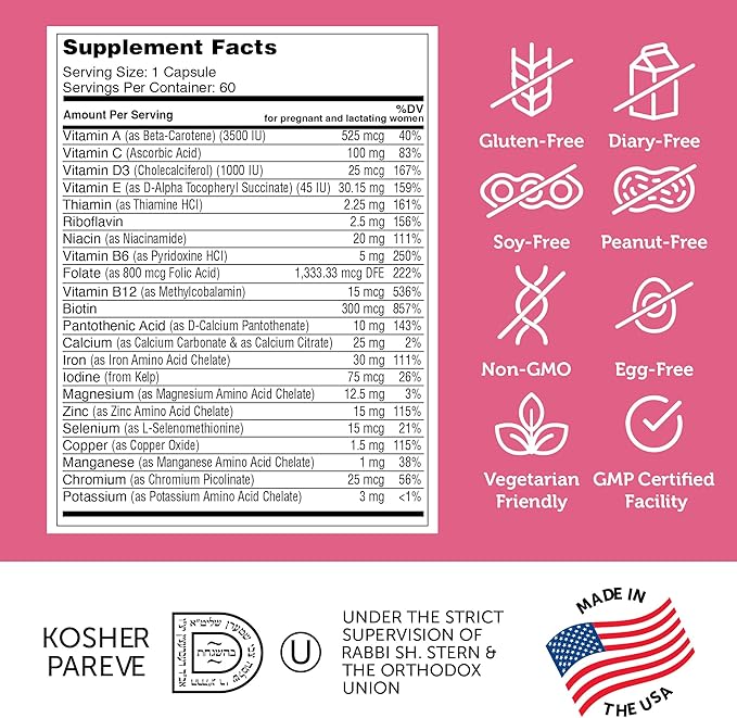- PRENATAL MULTI SUPPORT - Each easy to swallow capsule contains: Vitamins A, C, D3, E, B6, B12, Thiamin, Riboflavin, Niacin, Folate, Biotin, Pantothenic Acid, Calcium, Iron, Iodine, Magnesium, Zinc, Selenium, Copper, Manganese, Chromium and Potassium.