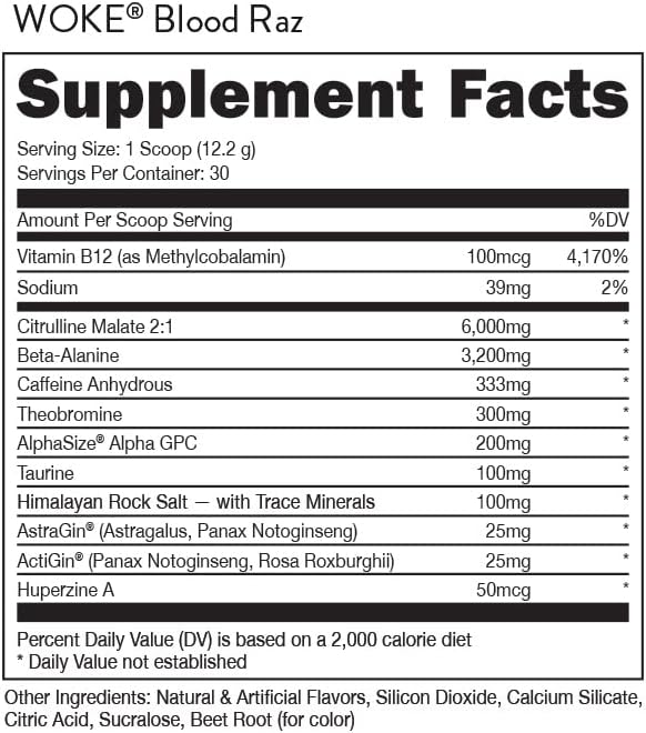 Bucked Up - Woke - HIGH STIM Pre Workout - Best Tasting - Focus Nootropic, Pump, Strength and Growth, 30 Servings (Blood Raz)