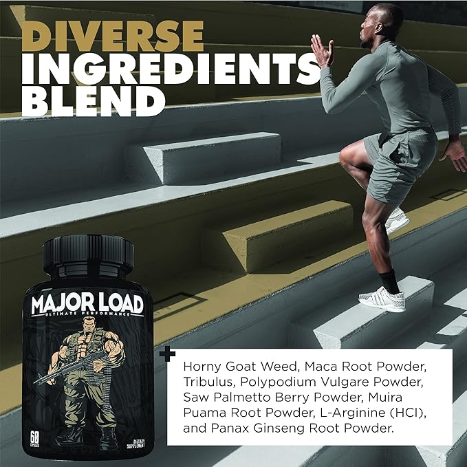 - Ultimate Ingredients - Harness the power of Horny Goat Weed, L-Arginine, Tribulus Terrestris, Tongkat Ali, Maca Root, & more. Major Load combines potent ingredients into one ultimate enhancing supplement. Experience a surge of energy & vitality.