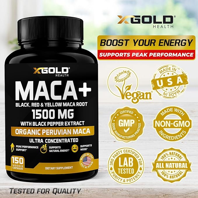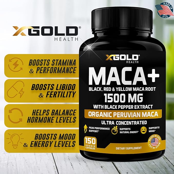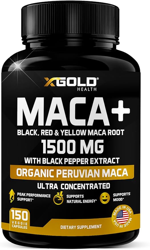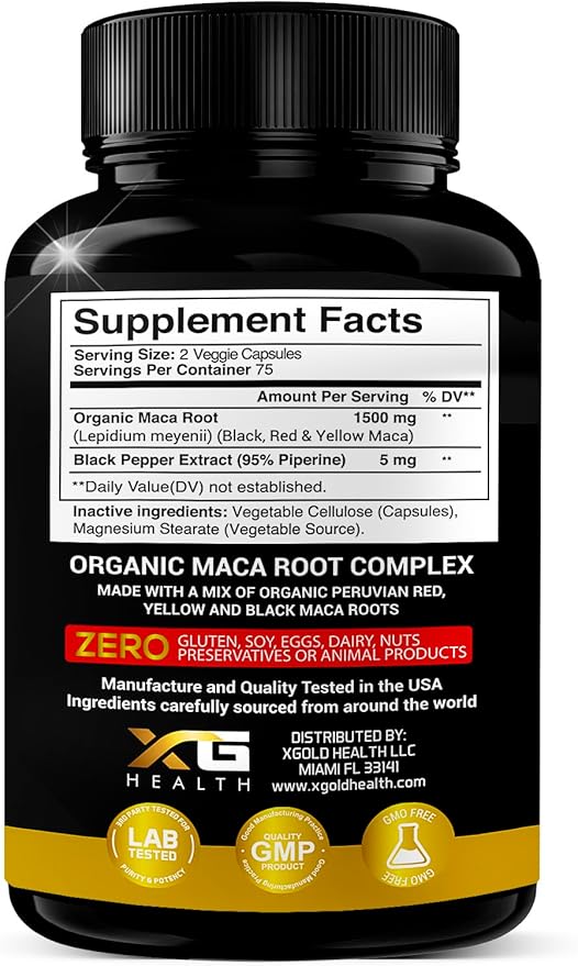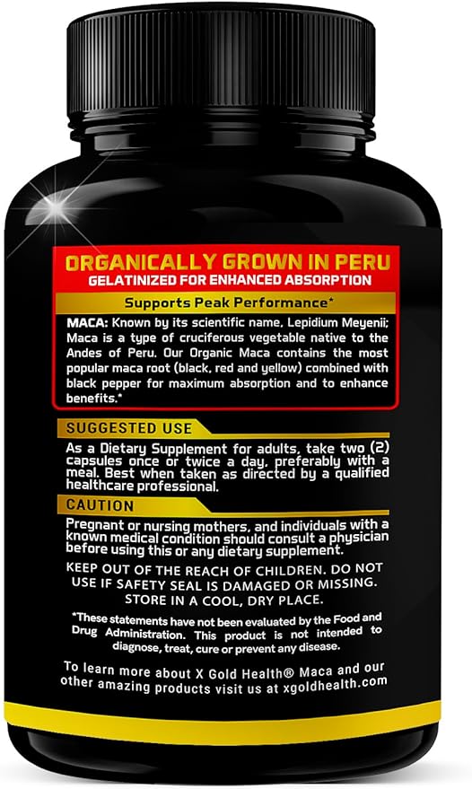 - STRONG PREMIUM BLEND OF THREE ORGANIC MACA ROOTS (BLACK, RED & YELLOW). X Gold Health Maca Capsules contain 1500mg of the highest quality Organic Maca root in each serving. Our Maca is organically grown in Peru We've combined a unique premium blend of three specially sourced Maca root extracts, black, red, and yellow, a powerful natural complex.