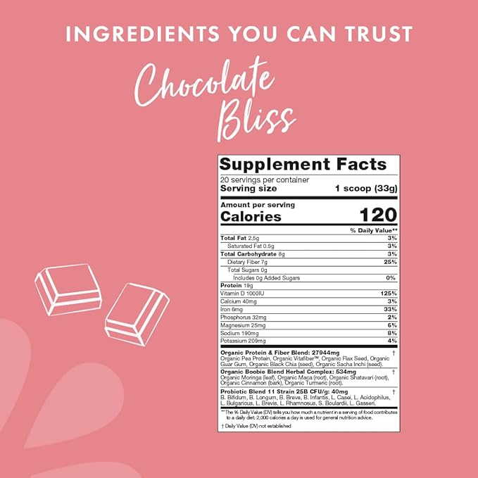 Boobie Body Superfood Protein Shake for Moms, Pregnancy Protein Powder, Lactation Support to Increase Milk Supply, Probiotics, Organic, Diary-Free, Gluten-Free, Vegan - Chocolate Bliss (20 servings)