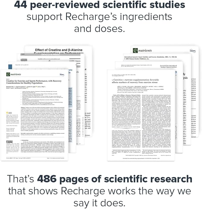 - 44 peer-reviewed scientific studies support Recharge’s combination of ingredients and doses, including flavored creatine. That’s 486 pages of scientific research that shows Recharge muscle builder for men and women works exactly like we say it does.