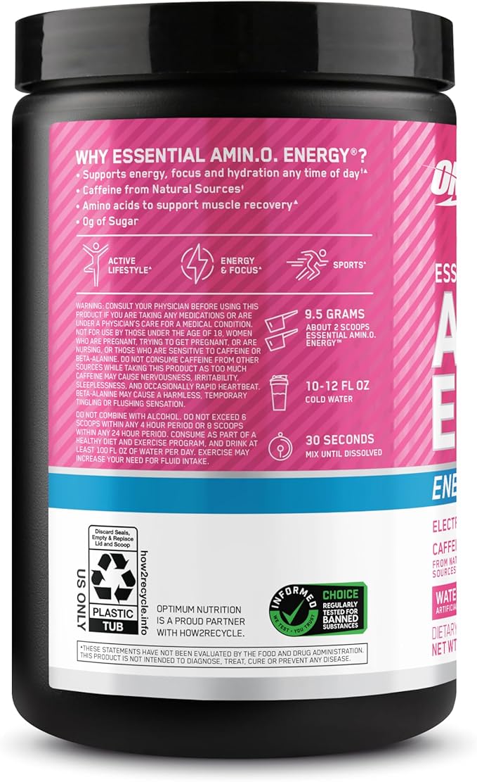 Optimum Nutrition Amino Energy Powder Plus Hydration, with BCAA, Electrolytes, and Caffeine, Watermelon Splash, 30 Servings (Packaging May Vary)